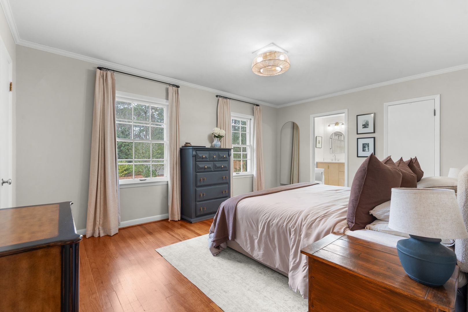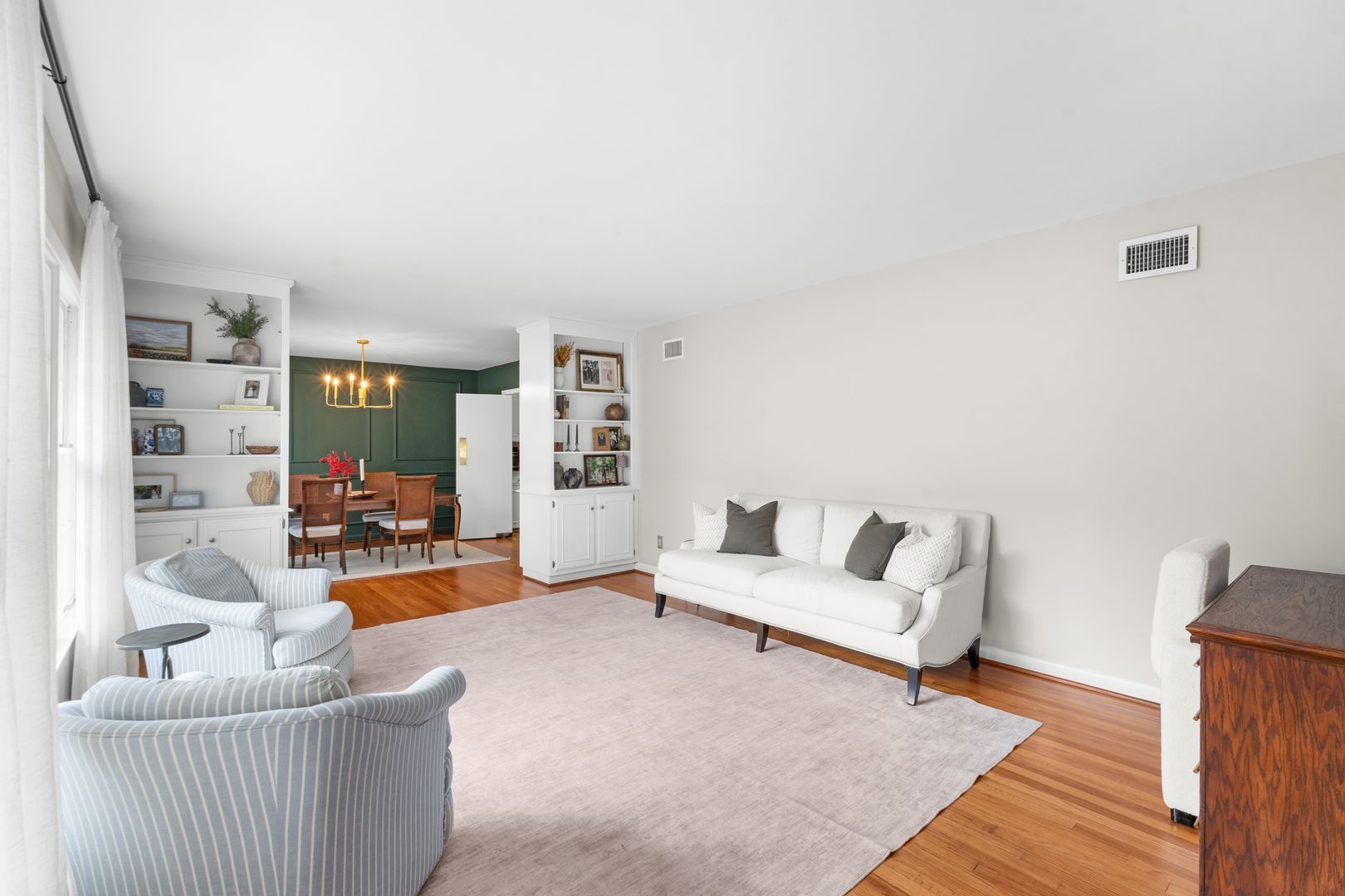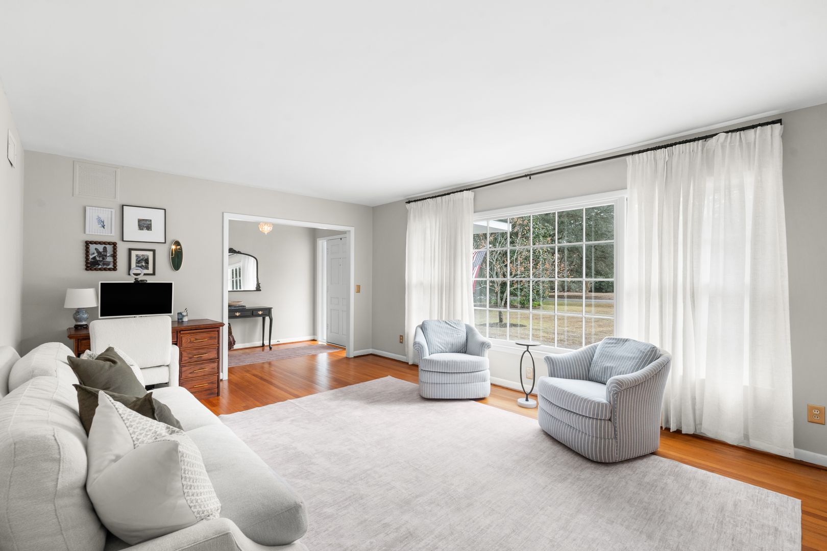 This charming 3-bedroom, 2-bath home offers classic style, thoughtful updates, and inviting living spaces on a beautifully landscaped lot. A welcoming front porch and manicured lawn set the tone as you step inside to find light-filled interiors with hardwood floors and a comfortable, flowing layout. The spacious living room features large windows that bring in abundant natural light and create a warm, relaxing atmosphere.